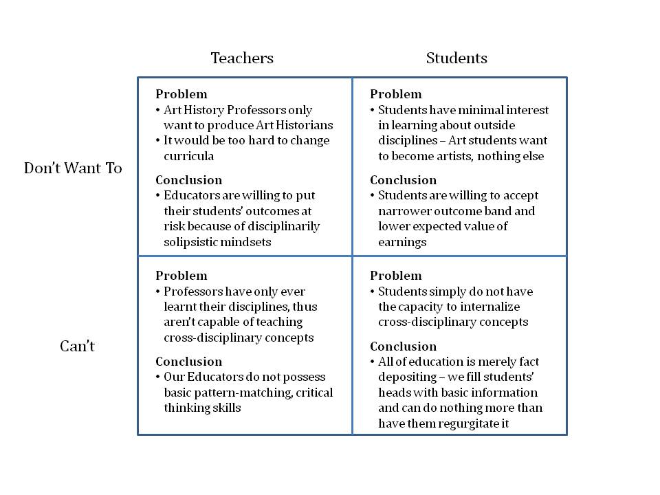 Efficacy in cross-disciplinary pedagogy is a separate issue entirely and this is where we hit the Students Can’t / Won’t quadrants. If you believe students are the problem, you’d have to believe that students willfully disdain the opportunity to broaden their educational awareness or that they are simply incapable of being taught critical thinking skills. We can reject the latter case outright because it reduces the entire practice of education into mere fact deposition and re-collection.